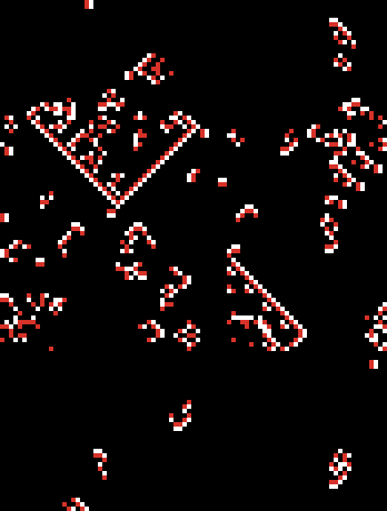 Typical CAs use two cell states (live and dead), but Brian's Brian uses three: firing (white), refractory (red), and dead (black).