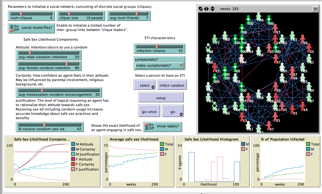 The NetLogo model is organized as a social network of agents arranged as mostly discrete social circles, with some (optional) central agents (“social butterflies”) that have links to central members of other social groups in addition to links to all members in their clique. Agents start with a certain number of friendship links (limited to between others in their clique), and no sexual partner links. Friend links are gender independent, but sexual partners are not – they require a coupling of one male and one female agent. Individual agent variables are assigned randomly following a normal distribution based on slider or global values.