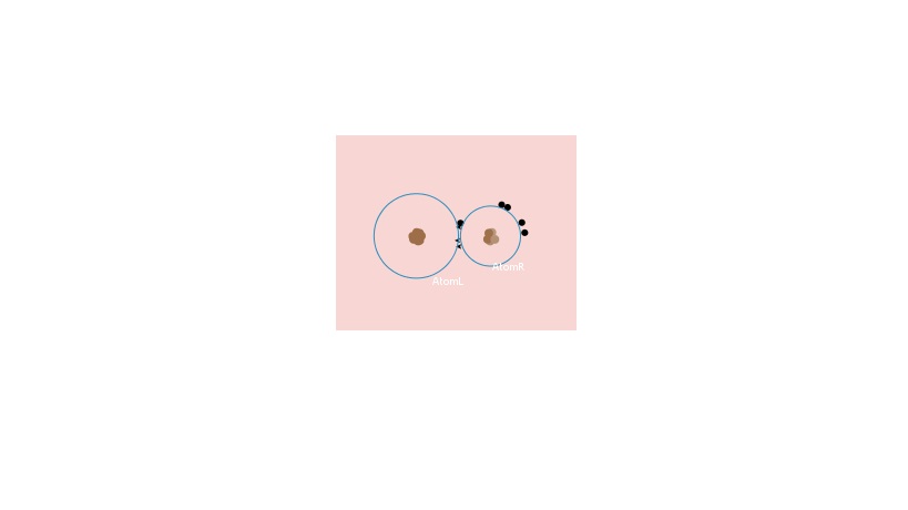 Setting valence electrons of AtomL (the left atom) defines AtomR's valence electrons in a way that both are sum to total of 8 valence electrons. Setting number of valence electrons affect electronegativity and atom's size: When numer of electrons increases - atom's size increases and electronegativity decreases. The electronegativity value is color coded - the atom's circle changes from light purple to dark. When run - the atoms move toward each other and from a certain distance between them, the electrons move from the atom with the lower electronegativity to the second atom.
