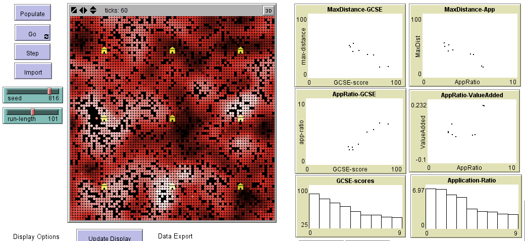 Four school exist in this imaginary catchment. All school have the same number of places available to prospective pupils (set by the 'SchoolSize' slider). Schools differ in their quality, determined by their 'GCSE-score' (analagous to the percentage of students with GCSE grades A* - C in the previous year). GCSE-score is assigned to each school randomly using a normal distribution with mean 50 and standard deviation 20. GCSE-scores of the four schools are shown in the 'GCSE-scores' bar chart.