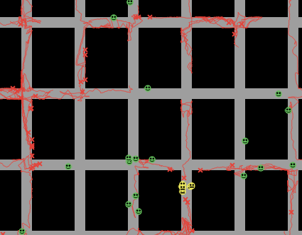 globals[] patches-own[] turtles-own[] breed[zombies zombie] breed[mortals mortal] to setup clear-all ask patches [ if(pxcor mod 15 = 0 or pycor mod 20 = 0 )[ ask neighbors[set pcolor gray] set pcolor gray ] ] zombieSetup mortalsSetup reset-ticks end to go ask zombies[attack] ask mortals[avoid] tick end ;;Breeds Movement Functions to attack if(zombiePen = true)[pen-down] killIfAnyNear ifelse (any? mortals in-radius zombieVision)[headTowardsMortal][headRandom] forward zombiesSpeed + (random randomnessInzombiesSpeed) * zombiesSpeed end to avoid let zombieAround other zombies in-cone mortalVision mortalVisionAngle ifelse any? zombieAround[runaway][moveHappily] end ;;Zombies Movement Functions to headTowardsMortal set heading (towards min-one-of mortals [distance myself]) + randomAngleRange randomnessInzombiesDirection moveTowardsValidPatch (zombiesSpeed + (random randomnessInzombiesSpeed) * zombiesSpeed) black 90 end to headRandom right randomAngleRange 10 moveTowardsValidPatch (zombiesSpeed + (random randomnessInzombiesSpeed) * zombiesSpeed) black 10 end ;;Mortals Movement Functions to runaway set shape "face neutral" set color yellow set heading (towards min-one-of zombies [distance myself]) + 180 moveTowardsValidPatch (mortalSpeed + mortalSpeed * mortalRunawaySpeedMultiplier) black 90 forward mortalSpeed + mortalSpeed * mortalRunawaySpeedMultiplier end to moveHappily set shape "face happy" set color green right randomAngleRange 10 moveTowardsValidPatch (mortalSpeed) black 10 forward mortalSpeed end ;;Auxiliary to-report patchAheadIsInvalid[distanceOfMovement forbiddenColor] ifelse([pcolor] of patch-ahead distanceOfMovement = forbiddenColor)[report true][report false] end to moveTowardsValidPatch[distanceOfMovement forbiddenColor randomRange] if(patchAheadIsInvalid distanceOfMovement forbiddenColor)[while[patchAheadIsInvalid distanceOfMovement forbiddenColor][right randomAngleRange randomRange]] end to-report randomAngleRange[range] report random range - random range end to getSick set breed zombies set color red set size 2 set shape "x" end to killIfAnyNear if any? mortals in-radius zombieKillingRange[ ifelse contagious [ ask mortals in-radius zombieKillingRange[getSick] ][ ask mortals in-radius zombieKillingRange[die] ] ] end ;;Setup Functions to zombieSetup create-zombies zombiePopulation[ set color red set size 2 set shape "x" setxy random-xcor random-ycor while[pcolor = black][setxy random-xcor random-ycor] ] end to mortalsSetup create-mortals mortalPopulation[ set color green set size 2 set shape "face happy" setxy random-xcor random-ycor while[pcolor = black][setxy random-xcor random-ycor] ] end
