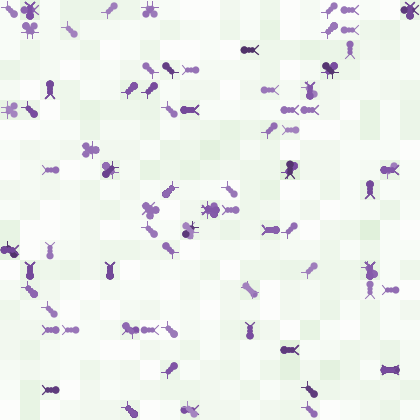 Plantoids compete for space in the terrain, whenever a plantoid has more than half of the energy of any of its neighbors it replicates, taking the space previously occupied by its neighbor. The interaction and energy transfer between replicators follows Netlogo's Echo model.