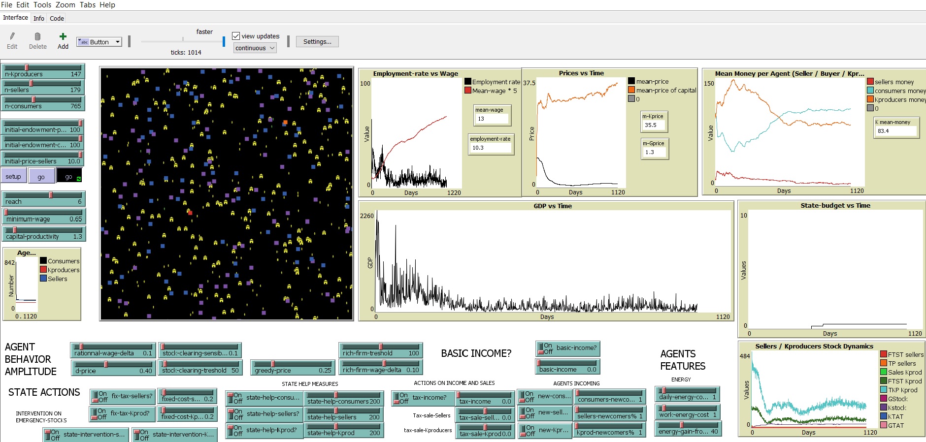 As an observer/state, you can directly interact with the system, by using all tools available. You can enable (disable) some types of taxations, modify their amount, and set the minimum wage imposed by the state to the agents. No agent can pay its employees below this amont, so be careful ! A too high minimum-wage can destroy the firms, but a too low can make your consumers poor, and unable to buy goods, and at the end, die.