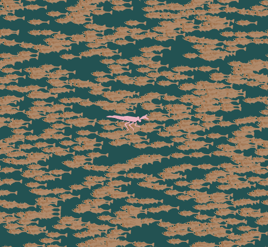 Stickleback fish only obtain food from the blue patches, and every move costs some energy. If a fish runs out the energy and no food can be obtained from the current patch, it dies.