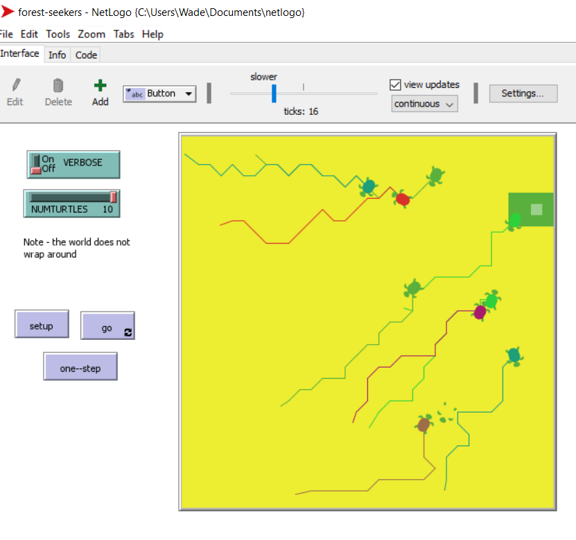 A simple tutorial model where turtles move through patches that have variable resistance to motion, at each step each turtle moves to the neigbhoring patch with least resistance of patches which are closer to the forest centroid than it is.