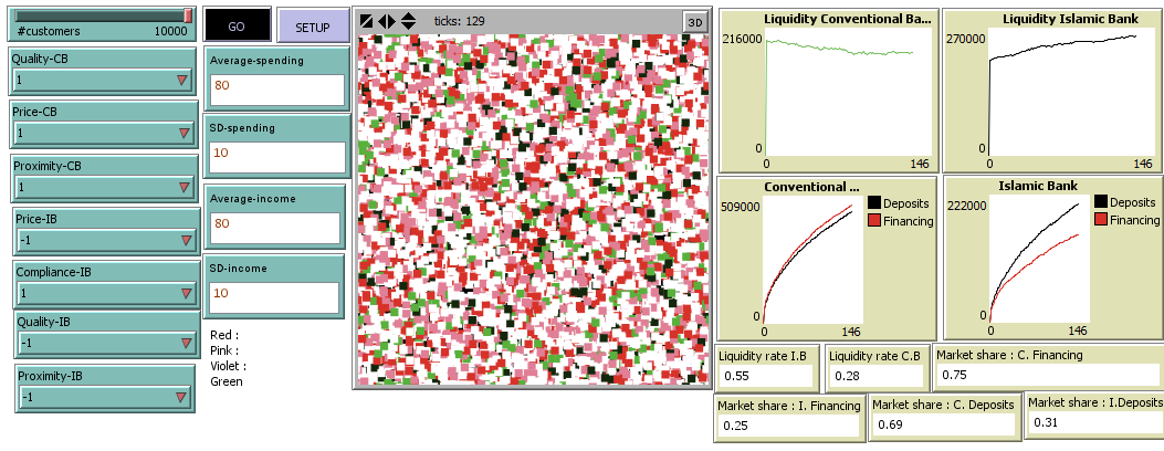 Globals [delta-richesse payback old-richesse besoin scenario proba-FIN-LARGE-BI proba-FIN-FAIBLE-BI proba-DEP-BI ] breed [Consommateurs Consommateur] breed [Banques banque] Consommateurs-own [segment revenu consommation richesse dette placement depot-IC depot-IB financement-IB financement-IC] Banques-own [nature gains depots capital cash financement qualité prix conformité proximité] to setup clear-all reset-ticks create-banques 1 [ Set Nature "I" set capital 200000 Set depots 0 Set cash capital Set gains 0 Set financement 0 Set qualité Quality-IB Set prix Price-IB Set conformité 1 hide-turtle ] create-banques 1 [ Set Nature "C" set capital 200000 Set depots 0 Set cash capital Set gains 0 Set financement 0 Set qualité Quality-CB Set prix Price-CB Set conformité 0 hide-turtle ] create-consommateurs #customers [ set shape "square" set color white setxy random-xcor random-ycor ] Set proba-FIN-FAIBLE-BI round ( 100 * exp (0.592 * Price-IB + 1.162 * Compliance-IB + 0.466 * Proximity-IB + 0.431 * Quality-IB) / (exp (0.592 * Price-IB + 1.162 * Compliance-IB + 0.466 * Proximity-IB + 0.431 * Quality-IB) + exp (0.592 * Price-CB - 1.162 + 0.466 * Proximity-CB + 0.431 * Quality-CB) ) ) Set proba-FIN-LARGE-BI round ( 100 * exp (0.998 * Price-IB + 1.004 * Compliance-IB + 0.361 * Proximity-IB + 0.431 * Quality-IB) / (exp (0.998 * Price-IB + 1.004 * Compliance-IB + 0.361 * Proximity-IB + 0.431 * Quality-IB) + exp (0.998 * Price-CB - 1.004 + 0.361 * Proximity-CB + 0.431 * Quality-CB) ) ) Set proba-DEP-BI round ( 100 * exp (0.422 * Price-IB + 0.939 * Compliance-IB + 0.480 * Proximity-IB + 0.428 * Quality-IB) / (exp (0.422 * Price-IB + 0.939 * Compliance-IB + 0.480 * Proximity-IB + 0.428 * Quality-IB) + exp (0.422 * Price-CB - 0.939 + 0.480 * Proximity-CB + 0.428 * Quality-CB))) end To Go while [ticks < 200] [ set delta-richesse 0 Set payback 0 Ask consommateurs [ set color white set revenu round random-normal Average-income SD-income set consommation round random-normal Average-spending SD-spending Set delta-richesse revenu - consommation ifelse (revenu - consommation) > 0 [ ifelse ( dette > 0 ) [ ifelse ( (revenu - consommation) >= dette ) [ Ifelse ( random 101 < proba-DEP-BI) [ set color 55 ] [ set color RED ] ;; dessine des agents sous forme de carrés colorés set scenario "A" set payback dette set dette 0 set richesse richesse + (revenu - consommation) ] [ set scenario "B" set payback (revenu - consommation) set dette dette - (revenu - consommation) set richesse richesse + (revenu - consommation) ] ] [ ;; cas ou il n'y a pas de dette ifelse random 101 < proba-DEP-BI [ set color 55 ] [ set color RED ] set scenario "C" set richesse richesse + (revenu - consommation) ] ] [ ;; cas ou la consommation depasse le revenu ifelse ( richesse < consommation - revenu ) [ Let binary random 2 ;; variable temporaire IFELSE random 101 < (binary * proba-FIN-FAIBLE-BI + binary * proba-FIN-LARGE-BI) [ set color 51 ] [ set color pink ] ;; dessine des agents sous forme de carrés colorés ifelse richesse > 0 [ set scenario "D" set old-richesse richesse set besoin consommation - revenu - richesse set richesse richesse + (revenu - consommation) set dette dette + besoin ] [ set scenario "F" set besoin consommation - revenu set richesse richesse + (revenu - consommation) set dette dette + besoin ] ] [ set scenario "E" set richesse richesse + (revenu - consommation) ] ] IFELSE random 101 < proba-DEP-BI ;; fonction de décision pour les dépots [ ask banques with [Nature = "I"] [ IF scenario = "A" [ set depots depots + delta-richesse - payback Set cash cash + delta-richesse - payback ] IF scenario = "C" or scenario = "E" [ set depots depots + delta-richesse Set cash cash + delta-richesse ] IF scenario = "D" [ set depots depots - old-richesse Set cash cash - old-richesse ] ] ] [ ask banques with [Nature = "C"] [ IF scenario = "A" [ set depots depots + delta-richesse - payback Set cash cash + delta-richesse - payback ] IF scenario = "C" or scenario = "E" [ set depots depots + delta-richesse Set cash cash + delta-richesse ] IF scenario = "D" [ set depots depots - old-richesse Set cash cash - old-richesse ] ] ] Let binary random 2 ;; variable temporaire IFELSE random 101 < (binary * proba-FIN-FAIBLE-BI + binary * proba-FIN-LARGE-BI) ;; fonction de décision pour les financements [ ask banques with [Nature = "I"] [ IF scenario = "A" [ set financement financement - payback set cash cash + payback ] IF scenario = "B" [ set financement financement - payback set cash cash + payback ] IF scenario = "D" [ set financement financement + besoin set cash cash - besoin ] IF scenario = "F" [ set financement financement + besoin set cash cash - besoin ] ] ] [ ask banques with [Nature = "C"] [ IF scenario = "A" [ set financement financement - payback set cash cash + payback ] IF scenario = "B" [ set financement financement - payback set cash cash + payback ] IF scenario = "D" [ set financement financement + besoin set cash cash - besoin ] IF scenario = "F" [ set financement financement + besoin set cash cash - besoin ] ] ] ] tick ] End