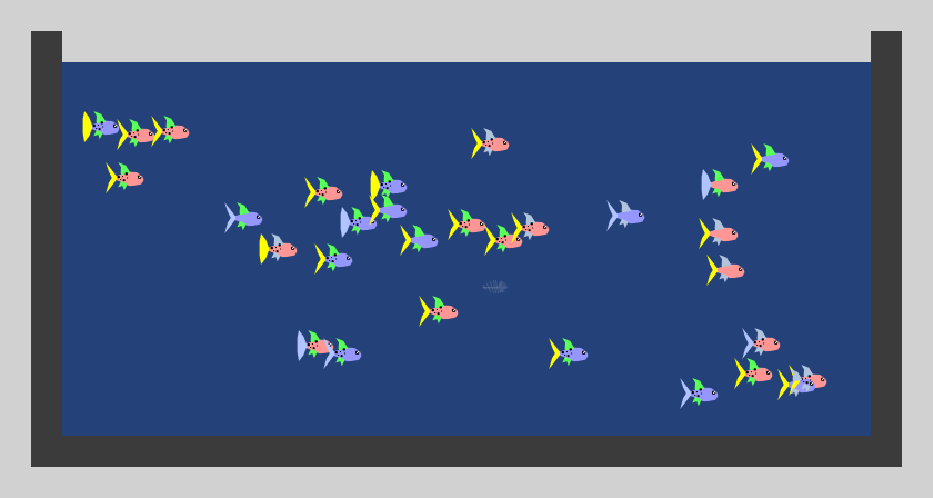 Transparency is used to visualize the death of fish. When a fish dies, the fish shape is removed and a bone shape appears and then gradually fades to transparent when a fish is removed from the population.