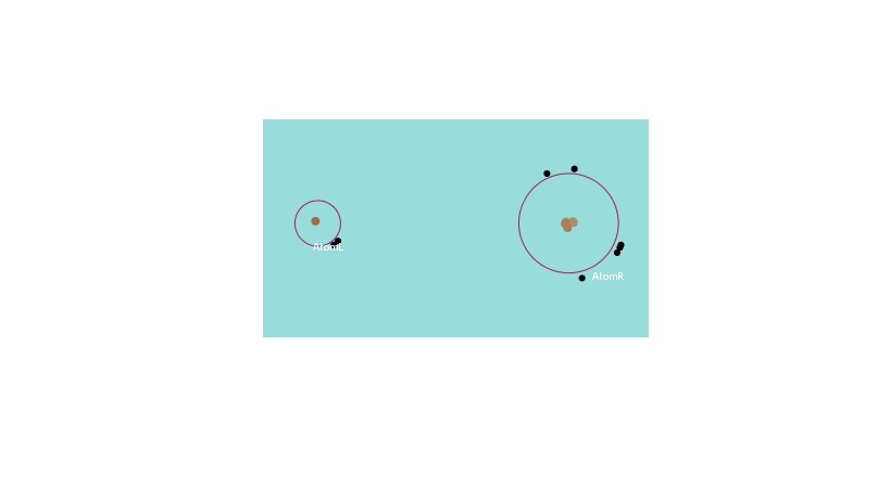 Setting valence electrons of AtomL (the left atom) defines AtomR's valence electrons in a way that both are sum to total of 8 valence electrons. Setting number of valence electrons affect electronegativity and atom's size: When numer of electrons increases - atom's size increases and electronegativity decreases. The electronegativity value is color coded - the atom's circle changes from light purple to dark. When run - the atoms move toward each other and from a certain distance between them, the electrons move from the atom with the lower electronegativity to the second atom.
