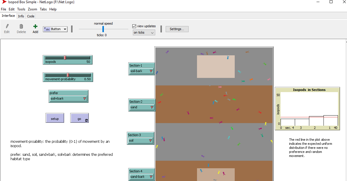 The final steps are to press the setup button and then the go button. The model runs until the last isopod has reached its preferred substrate. The View Updates option is set to update on each "tick" this offers a better view of individual movements. Choosing continuous updates offers a rapid conclusion.