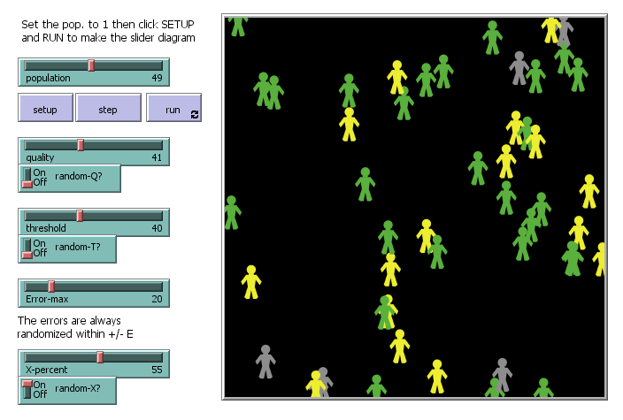 If you shut off all the randomizing switches, with a population of 1, and set Error-max to zero ( no diversity ), confirm that if Q is less than T, there is no green area ( no one stands at all) and if Q is greater than T, everyone stands on the first pass.