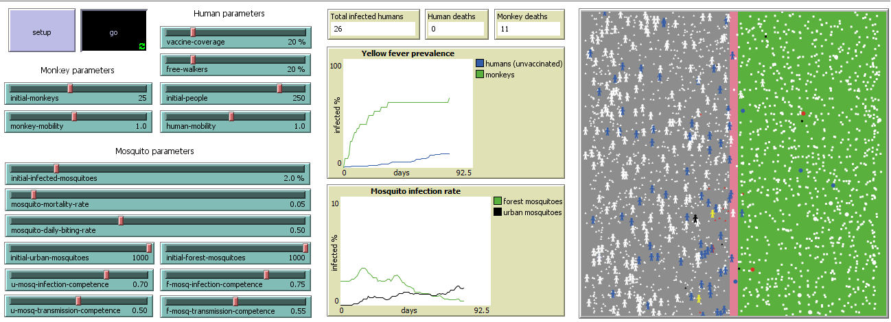 The graph YELLOW FEVER PREVALENCE shows the cumulative percentage of the population of unvaccinated humans and monkeys that were infected with YFV. The graph MOSQUITO INFECTION RATE shows the percentage of infected individuals per day in the populations of forest and urban mosquitoes. The three monitors above the graphs show the total humans that were infected, the infected humans that died, and the total monkeys that died during the outbreak.