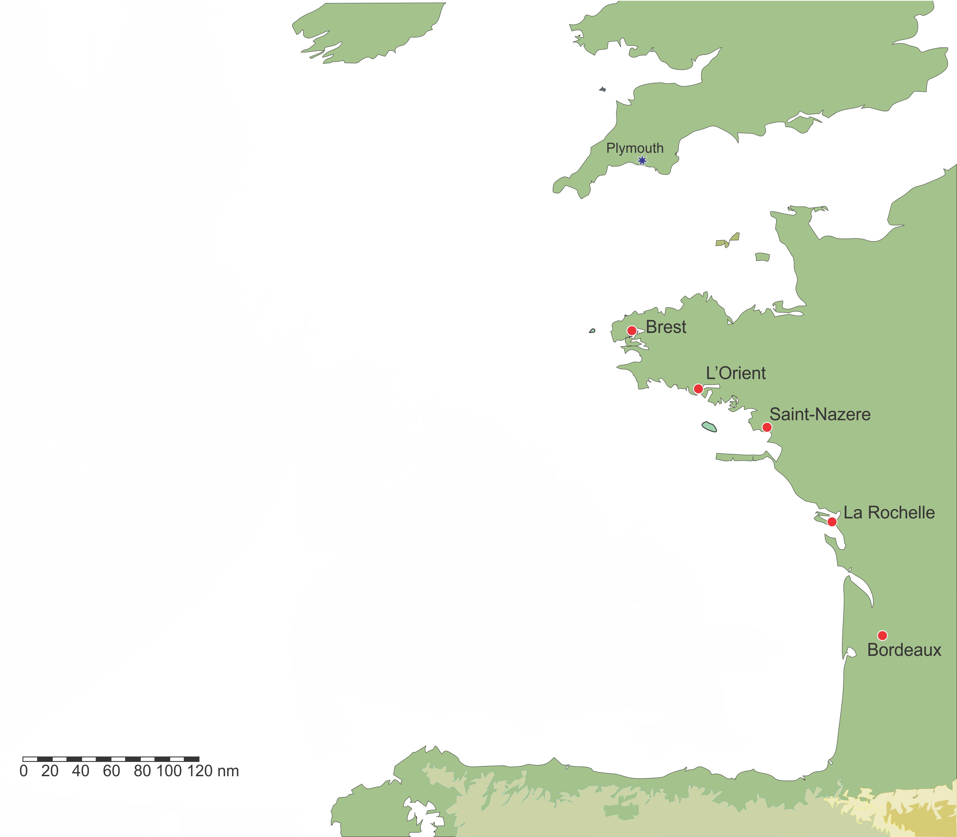 The Battle of the Bay of Biscay began in late 1940 and lasted until early 1944. Activity did not begin in earnest until late 1941, and data only becomes available in January 1942. By the spring of 1944 the British had nearly complete dominance of the approaches to the French coast. Submarine deployments after that point were limited to small numbers and transits nearly stopped completely after D-Day (June 1944). This model was built around the high-tempo operations of 1942 and 1943. It was a battle between the German submarine force and the Royal Air Force. For the most part these were German Type VIIC submarines and British Short Sunderland (S.25) four-engine ASW aircraft. The British were based in Plymouth and the Germans were evenly spread among the five U-boat bases. U-boats in port were protected by thick concrete “pens” that are so indestructible that they remain in these five ports to this day. The only way to counter a U-Boat was to sink it at sea. The German mission was to move the U-boats to the North Atlantic where they would attack convoys. The UK mission was to sink as many transiting U-boats as possible, and to delay the others. British operations research co-founder Arthur Waddington referred to the British goal as the creation of an “unclimable fence”. The fence would be so wide that a U-boat could not traverse it completely submerged. This years-long operation was seen by both sides as critical to victory. Winston Churchill famously said, “The only thing that ever really frightened me during the war was the U-Boat peril.”