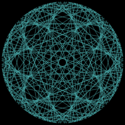 A number of points are distributed uniformly along the circumference of a circle, each labeled with an index arranged in ascending order from 0 to the number set by the slider labeled "modulo". A multiplication table is produced by multiplying the factor set by the slider labeled "mult" and the index of each point modulo the number of points. The result at each point is taken as the index of another point on the circumference and these two points are then joined with a straight line.