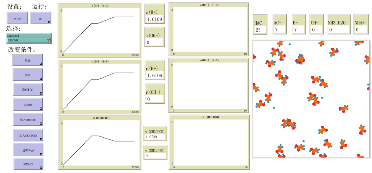 ; Li Ying created this module at Shaanxi Normal University in 2024. If you mention this model in a publication, we ask that you include the citations below. ;Ying, L. (2024). Ionization Equilibrium. School of Chemistry and Chemical Engineering, Shaanxi Normal University. breed [mode5_h2o_t mode5_h2o] breed [mode5_h_t mode5_h] breed [mode5_oh_t mode5_oh] breed [mode5_na_t mode5_na] breed [mode5_cl_t mode5_cl] breed [mode5_nh4_t mode5_nh4] breed [mode5_nh3h2o_t mode5_nh3h2o] breed [mode5_ac_t mode5_ac] breed [mode5_hac_t mode5_hac] breed [mode5_nacl_t mode5_nacl] breed [mode5_naac_t mode5_naac] breed [mode5_nh4cl_t mode5_nh4cl] breed [mode5_nh4ac_t mode5_nh4ac] globals[ Init_flag Up_T_flag add_CH3COOH_flag add_hcl_flag add_NaOH_flag add_CH3COONa_flag add_nh3_flag add_NH4Cl_flag add_water_flag h_count oh_count ac_count hac_count nh3h2o_count nh4_count plot1 plot2 plot3 plot4 plot5 plot6 Up_T_figure_flag add_CH3COOH_figure_flag add_hcl_figure_flag add_NaOH_figure_flag add_CH3COONa_figure_flag add_nh3_figure_flag add_NH4Cl_figure_flag add_water_figure_flag ] to setup clear-all ;设置画布颜色白色 ask patches [ set pcolor white ] ;;初始化海龟 set-default-shape mode5_ac_t "ac" set-default-shape mode5_h_t "h" set-default-shape mode5_oh_t "oh" set-default-shape mode5_hac_t "hac" set-default-shape mode5_naac_t "naac" set-default-shape mode5_na_t "na" set-default-shape mode5_nh3h2o_t "nh3h20" set-default-shape mode5_nh4_t "nh4" set-default-shape mode5_nh4cl_t "nh4cl" set-default-shape mode5_cl_t "cl" if (Compound = "CH3COOH")[ create-mode5_hac_t (20) [ setxy random-xcor random-ycor set size 3 ] ] if (Compound = "NH3.H2O")[ create-mode5_nh3h2o_t (20) [ setxy random-xcor random-ycor set size 3 ] ] set Init_flag 0 set Up_T_flag 0 set add_CH3COOH_flag 0 set add_hcl_flag 0 set add_NaOH_flag 0 set add_CH3COONa_flag 0 set add_nh3_flag 0 set add_NH4Cl_flag 0 set add_water_flag 0 reset-ticks end to go if ticks mod 300 = 0 [ Hydrolytic_separation ask turtles [ fd 1 ;; move turtles around randomly rt random 360 lt random 360 ] if (Compound = "CH3COOH")[ set h_count count mode5_h_t set ac_count count mode5_ac_t set hac_count count mode5_hac_t set oh_count count mode5_oh_t ] if (Compound = "NH3.H2O")[ set nh3h2o_count count mode5_nh3h2o_t set nh4_count count mode5_nh4_t set h_count count mode5_h_t set oh_count count mode5_oh_t ] ] tick end ;;解离 to Hydrolytic_separation if (Compound = "CH3COOH")[ if Init_flag = 0[ let temp_number count mode5_hac_t if temp_number > 15[ if ticks mod 3000 = 0 [ let mode5_hac_t_molecule one-of turtles with [breed = mode5_hac_t] ;;将一个hac分子变成h + ac ask mode5_hac_t_molecule [ set breed mode5_h_t set size 2 ];;创建一个oh create-mode5_ac_t (1) [ setxy random-xcor random-ycor set size 3 ] ] ] if temp_number = 15[ set Init_flag 1 ] ] ] if (Compound = "NH3.H2O") [ if Init_flag = 0[ let temp_number count mode5_nh3h2o_t if temp_number > 15[ if ticks mod 3000 = 0 [ let mode5_nh3h2o_t_molecule one-of turtles with [breed = mode5_nh3h2o_t] ;;将一个hac分子变成h + ac ask mode5_nh3h2o_t_molecule [ set breed mode5_nh4_t set size 3 ];;创建一个oh create-mode5_oh_t (1) [ setxy random-xcor random-ycor set size 3 ] ] ] if temp_number = 15[ set Init_flag 1 ] ] ] end ;;加入按键 to add end ;;升温按键 to Up_T set Up_T_figure_flag 1 if (Compound = "CH3COOH")[ if Up_T_flag = 0[ if ticks mod 3000 = 0 [ let x 0 let y 0 if (count mode5_hac_t > 10)[ let turtle_mode5_hac_t n-of 1 mode5_hac_t ask turtle_mode5_hac_t [ set x xcor set y ycor set breed mode5_h_t set size 2 ] create-mode5_ac_t 1 [ setxy x y set size 3 ] ] if (count mode5_hac_t = 10)[ set Up_T_flag 1 ] ] ] ] if (Compound = "NH3.H2O")[ if Up_T_flag = 0[ if ticks mod 3000 = 0 [ let x 0 let y 0 if (count mode5_nh3h2o_t > 10)[ let turtle_mode5_nh3h2o_t n-of 1 mode5_nh3h2o_t ask turtle_mode5_nh3h2o_t [ set x xcor set y ycor set breed mode5_oh_t set size 3 ] create-mode5_nh4_t 1 [ setxy x y set size 3 ] ] if (count mode5_nh3h2o_t = 10)[ set Up_T_flag 1 ] ] ] ] end ;;加CH3COOH按键 to add_CH3COOH set add_CH3COOH_figure_flag 1 if (Compound = "CH3COOH")[ if ticks mod 3000 = 0 [ if add_CH3COOH_flag = 1[ let turtle_xys [] ; 创建一个空列表来存储坐标对 let turtle_mode5_hac_t n-of 2 mode5_hac_t ask turtle_mode5_hac_t [ let xys list xcor ycor ; 创建一个包含当前乌龟坐标对的列表 set turtle_xys lput xys turtle_xys ; 将当前乌龟的坐标对添加到列表中 set breed mode5_h_t set size 2 ] foreach turtle_xys [ xy -> create-mode5_ac_t 1 [ setxy (item 0 xy) (item 1 xy) ; 根据坐标对生成乌龟 set size 3 ; 可根据需要设置乌龟颜色 ] ] set add_CH3COOH_flag 2 ] if add_CH3COOH_flag = 0[ create-mode5_hac_t 10 [ setxy random-xcor random-ycor set size 3 ] set add_CH3COOH_flag 1 ] ] ] end ;;加水按键 to add_water set add_water_figure_flag 1 if (Compound = "CH3COOH")[ if add_water_flag = 0[ if ticks mod 3000 = 0 [ let x 0 let y 0 if (count mode5_hac_t > 8)[ let turtle_mode5_hac_t n-of 1 mode5_hac_t ask turtle_mode5_hac_t [ set x xcor set y ycor set breed mode5_h_t set size 2 ] create-mode5_ac_t 1 [ setxy x y set size 3 ] ] if (count mode5_hac_t = 8)[ set add_water_flag 1 ] ] ] ] if (Compound = "NH3.H2O")[ if add_water_flag = 0[ if ticks mod 3000 = 0 [ let x 0 let y 0 if (count mode5_nh3h2o_t > 8)[ let turtle_mode5_nh3h2o_t n-of 1 mode5_nh3h2o_t ask turtle_mode5_nh3h2o_t [ set x xcor set y ycor set breed mode5_oh_t set size 3 ] create-mode5_nh4_t 1 [ setxy x y set size 3 ] ] if (count mode5_nh3h2o_t = 8)[ set add_water_flag 1 ] ] ] ] end ;;加CH3COONa按键 to add_CH3COONa set add_CH3COONa_figure_flag 1 if (Compound = "CH3COOH")[ if ticks mod 3000 = 0 [ if add_CH3COONa_flag = 2[ ask mode5_ac_t [ let meeting-mode5_h_t mode5_h_t in-radius 10 if count meeting-mode5_h_t > 0 [ ; 在半径2的范围内相遇时,创建新的turtle let turtles-here-mode5_ac_t turtles with [breed = mode5_ac_t] let turtles-here-mode5_h_t turtles with [breed = mode5_h_t] let turtle_mode5_ac_t one-of turtles-he
