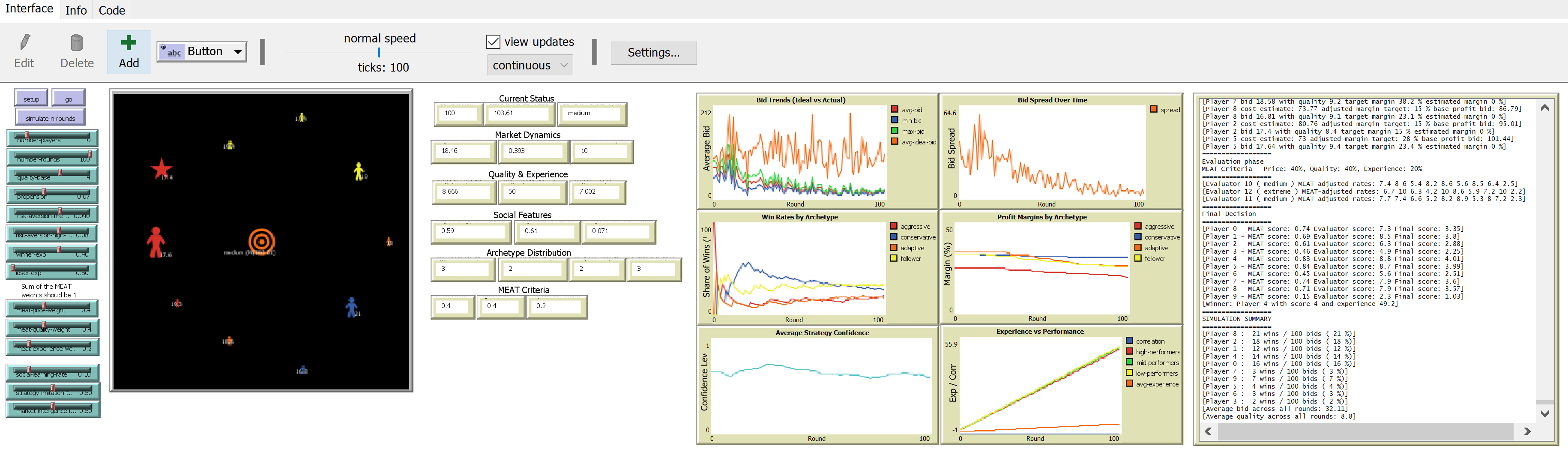 Evaluation & Learning: - MEAT Criteria: Tenders are awarded using the Most Economically Advantageous Tender (MEAT) criteria, which is a weighted combination of price, quality, and experience. You can adjust the weights of these criteria using the sliders. - Social Learning: Players learn from their peers. They observe the performance of others—not just who wins, but who wins profitably—and may imitate the strategies of the most successful players. This drives the evolution of strategies in the market.